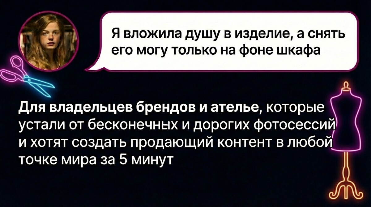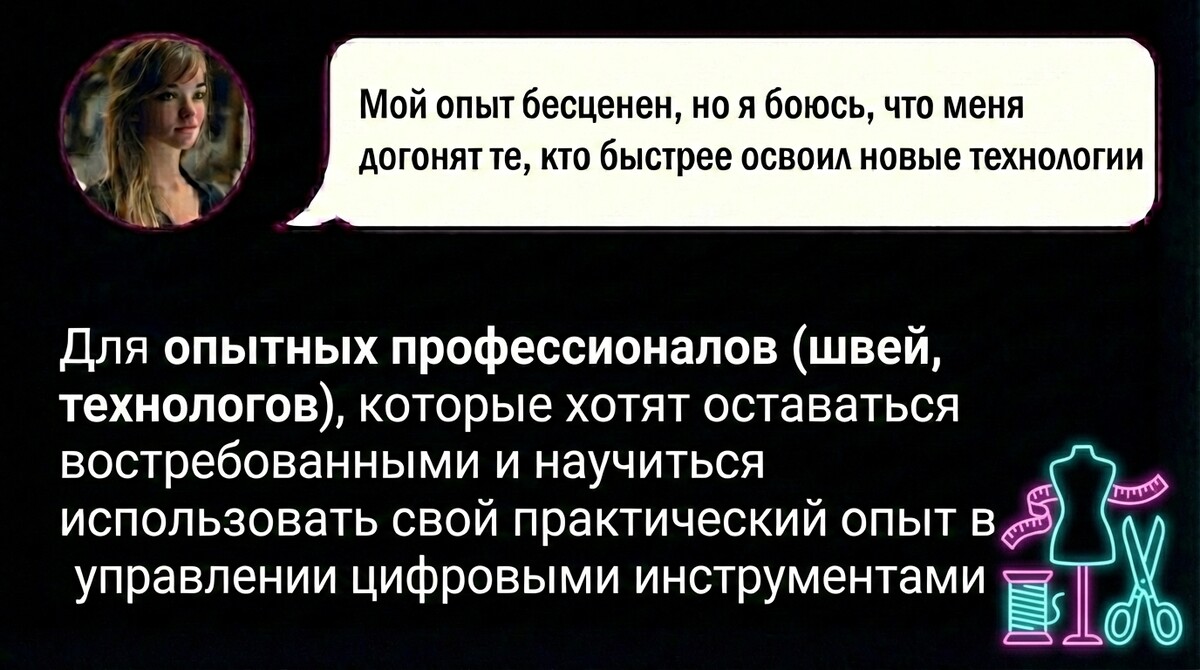 Мы научим вас специализированным ИИ, которые ПОНИМАЮТ язык дизайнера. Они знают, что такое вытачка, посадка по фигуре и многослойный тюль. Этими нейросетями пользуются мировые бренды в индустрии моды
